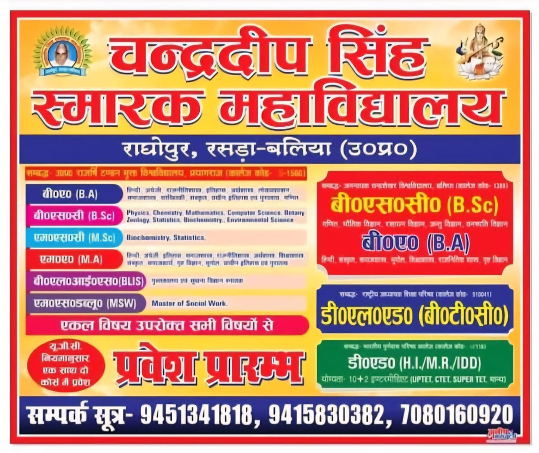 चन्द्रदीप सिंह स्मारक महाविद्यालय में हम शिक्षा को ज्ञान, चरित्र और संस्कृति का समन्वय मानते हैं। हमारा उद्देश्य विद्यार्थियों में ऐसी सोच विकसित करना है, जिससे वे जीवन के प्रत्येक क्षेत्र में सफलता प्राप्त कर सकें और समाज के प्रति अपनी जिम्मेदारियों का निर्वहन कर सकें। महाविद्यालय में अनुभवी शिक्षकों का मार्गदर्शन, अनुशासित वातावरण और आधुनिक शिक्षण पद्धतियाँ विद्यार्थियों के सर्वांगीण विकास में सहायक हैं। मैं सभी विद्यार्थियों से अपेक्षा करता हूँ कि वे निष्ठा, परिश्रम और सदाचार के मार्ग पर चलते हुए अपने सपनों को साकार करें और हमारे संस्थान का नाम गौरवान्वित करें।
